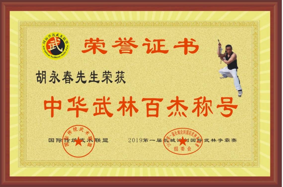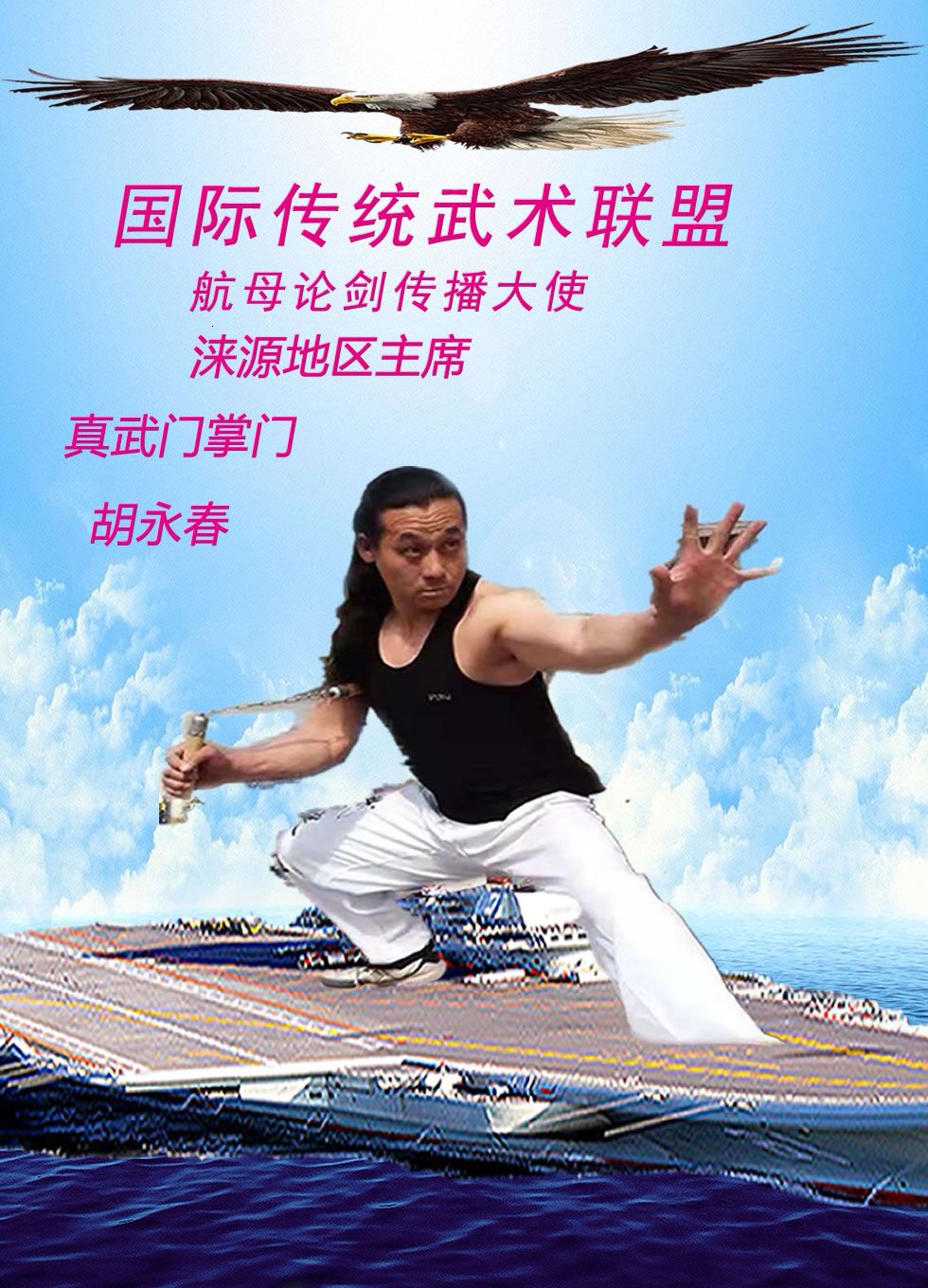 胡永春,国际传统武术联盟中国涞源地区主席!国际武术九段!中华真武门掌门!中华武林百杰人物!长城论剑10大名师推荐!一身正气!好打抱不平!擅长醉拳、地躺拳、板门大刀、双截棍!弟子上万人。桃李满天下!