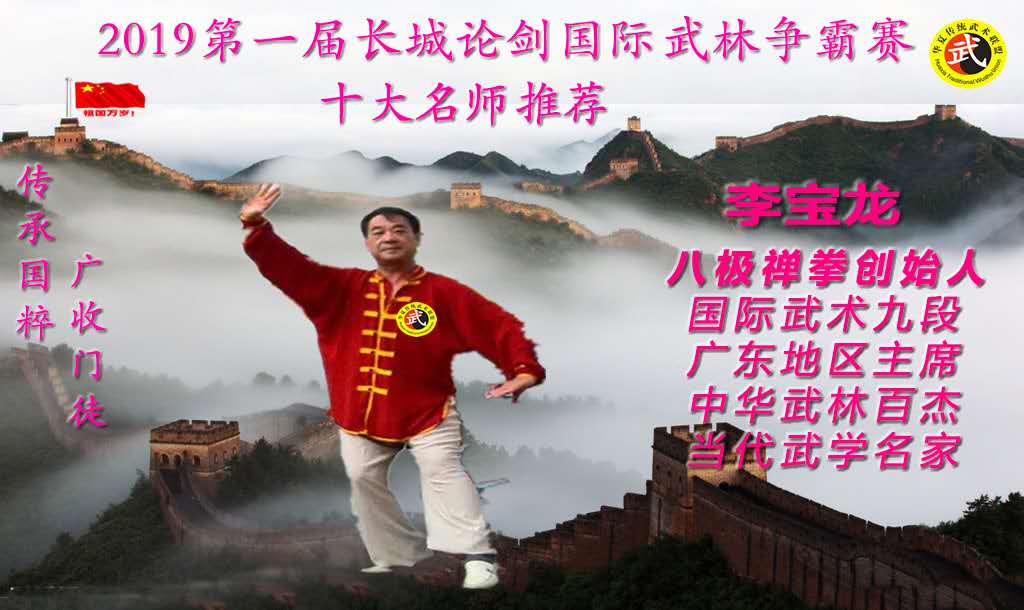 李宝龙老师,国际武术九段,2019第一届'长城论剑'国际武林争霸赛形象大使!当代武学名家!中华武林百杰人物!长城论剑推荐10大名师!精通少林武当多种功法。不惑之年创建八极禅拳,八极禅剑。八极禅拳集气功、健身、强身、养生于一体!八极禅剑,动作优美,舒筋活络。适合所有年龄段的人练习!李宝龙先生为中华传统武术发展献出了全部精力!为推动全民健身的国家战略做出了巨大的贡献!