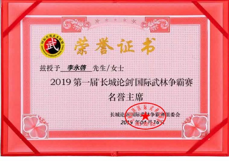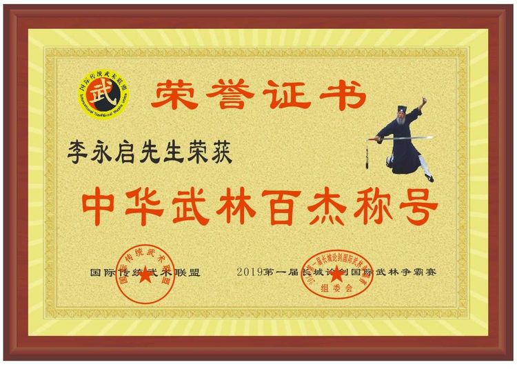 李永启先生,国际传统武术联盟会员,中国江苏地区主席,国际武术九段,国际武术高级教练,当代武学名家,中华武林百杰,2019第一届长城论剑形象大使!人送绰号:当代张三丰!