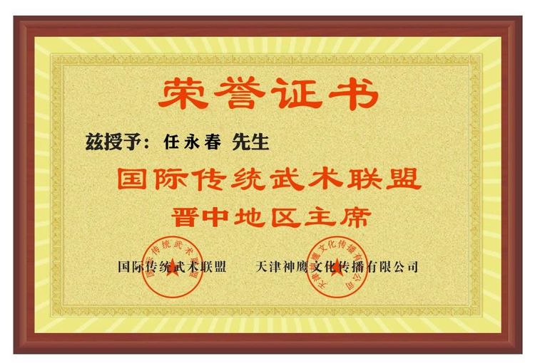 任永春老师, 山西人,国际传统武术联盟晋中地区主席,国际武术 七段 国际武术一级教练, 国际武术一级裁判员 ,2018航母论剑传播大使。