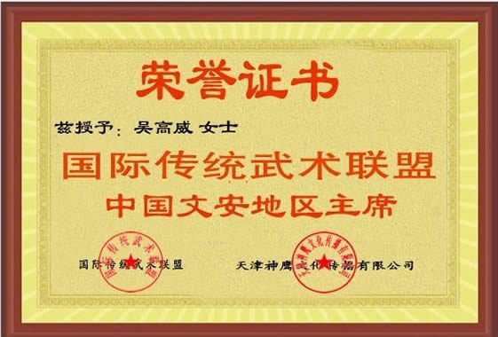 吴高威老师,河北霸州人,国际传统武术联盟 文安地区主席,国际武术 七段。