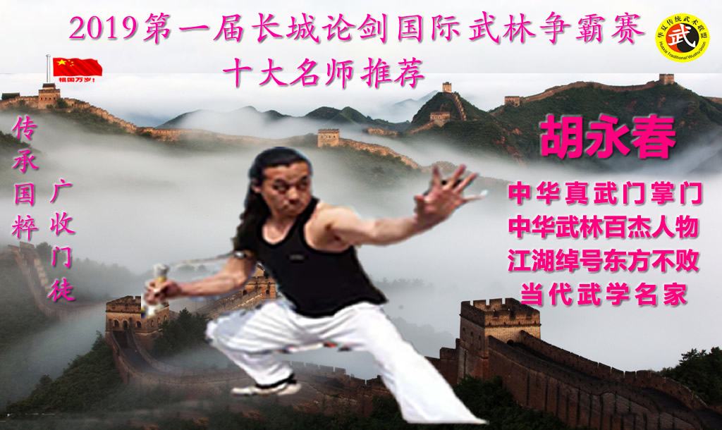 胡永春,国际传统武术联盟中国涞源地区主席!国际武术九段!中华真武门掌门!中华武林百杰人物!长城论剑10大名师推荐!一身正气!好打抱不平!擅长醉拳、地躺拳、板门大刀、双截棍!弟子上万人。桃李满天下!