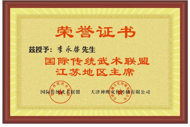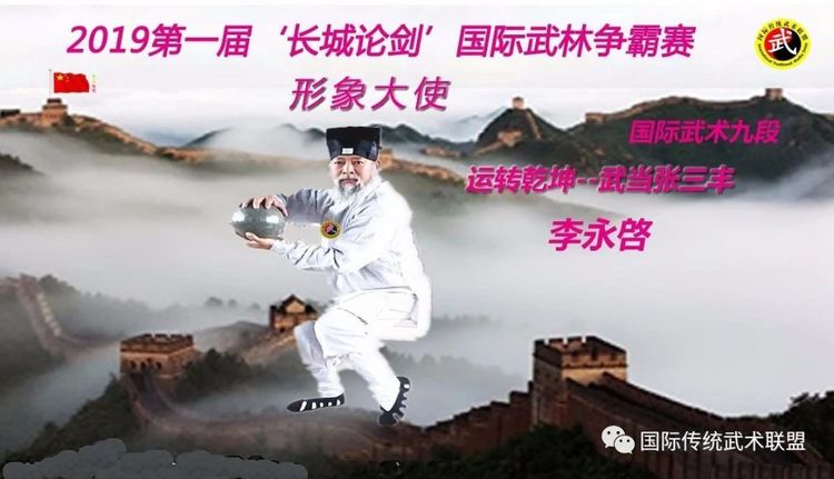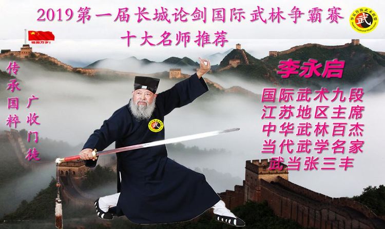 李永启先生,国际传统武术联盟会员,中国江苏地区主席,国际武术九段,国际武术高级教练,当代武学名家,中华武林百杰,2019第一届长城论剑形象大使!人送绰号:当代张三丰!